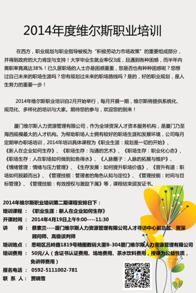 [ 公司动态 ] 厦门猎头维尔斯-《新人在企业如何生存》沙龙讲座,欢迎来电咨询!
